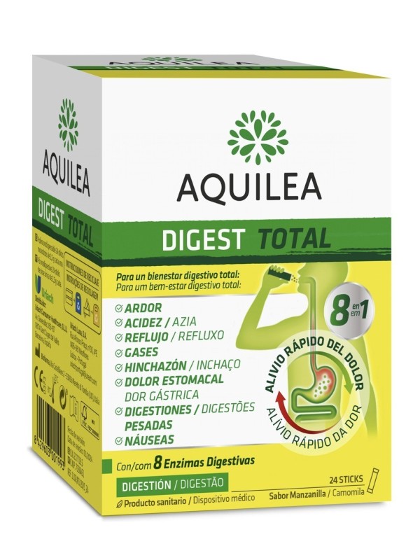 Aquilea digest total es un multisíntomas que actúa rápidamente combatiendo 8 síntomas digestivos: acidez, ardor, reflujo, gases, hinchazón, molestias en el estómago, digestiones pesadas y náuseas. Todo ello gracias a una combinación eficaz de ingredientes y 8 enzimas digestivas. Además, aquilea digest total viene en un cómodo stick para tomar directo en la boca con sabor manzanilla.